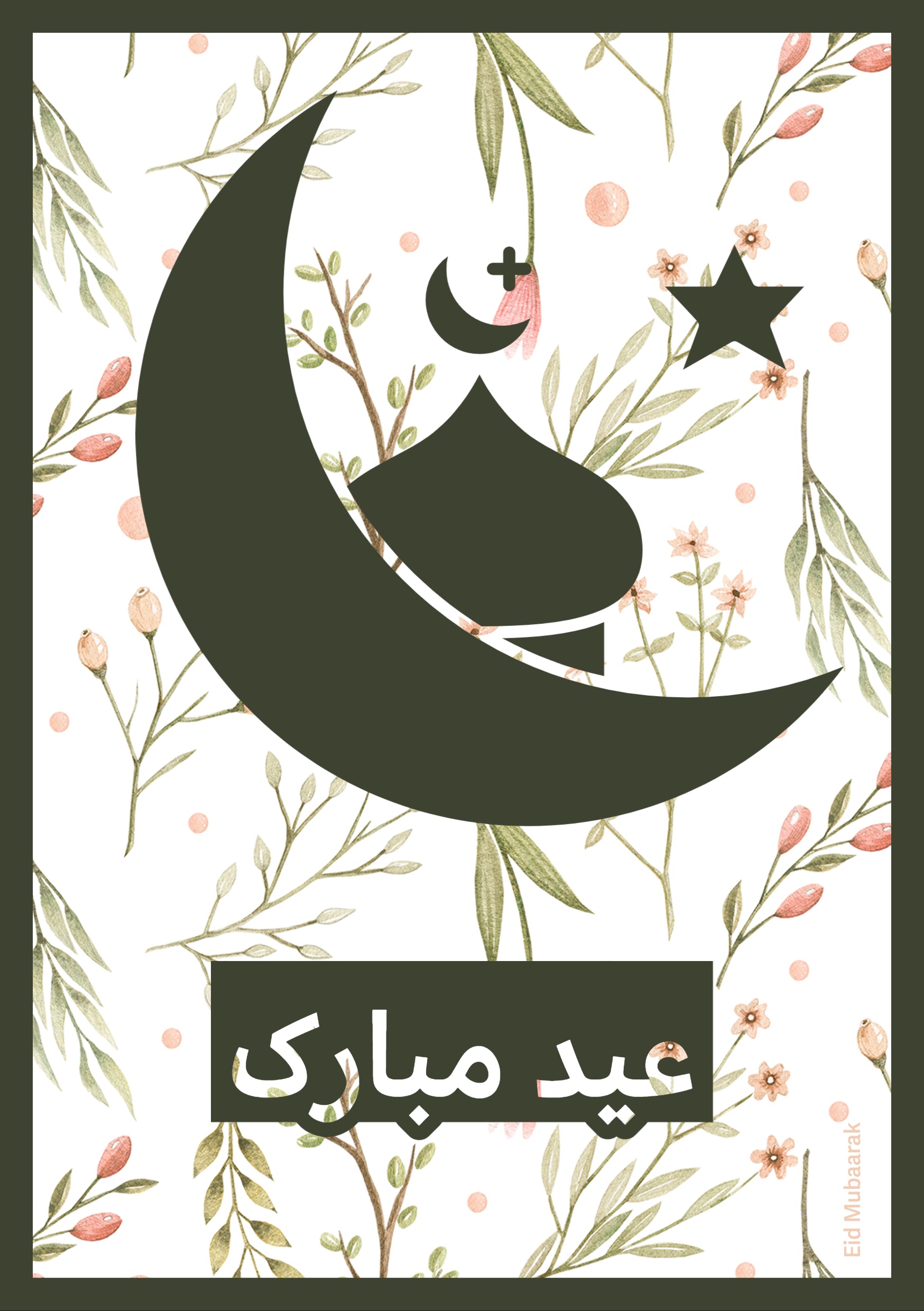 This card has a lovely balance between contemporary and classical. Silhouette of a mosque and crescent set against a backdrop of flowers.