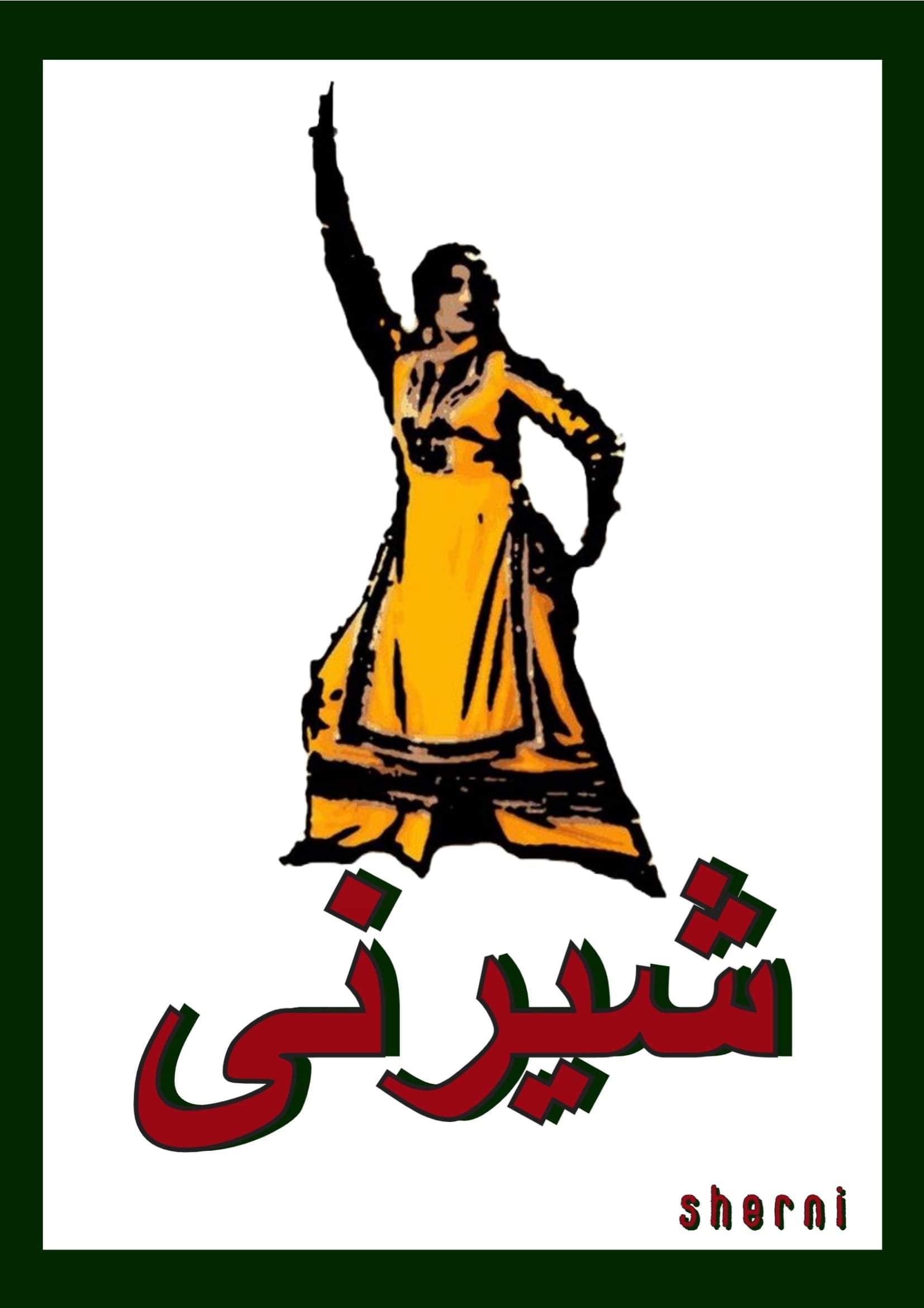 Woman in a dancing pose with 'Sherni' (lioness) written in Urdu.